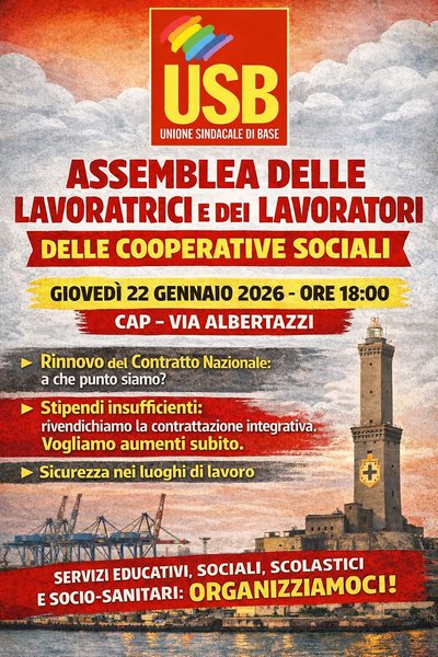 Genova. ASSEMBLEA LAVORATRICI E LAVORATORI DELLE COOPERATIVE SOCIALI Giovedì 22 gennaio 2026 – Ore 18:00