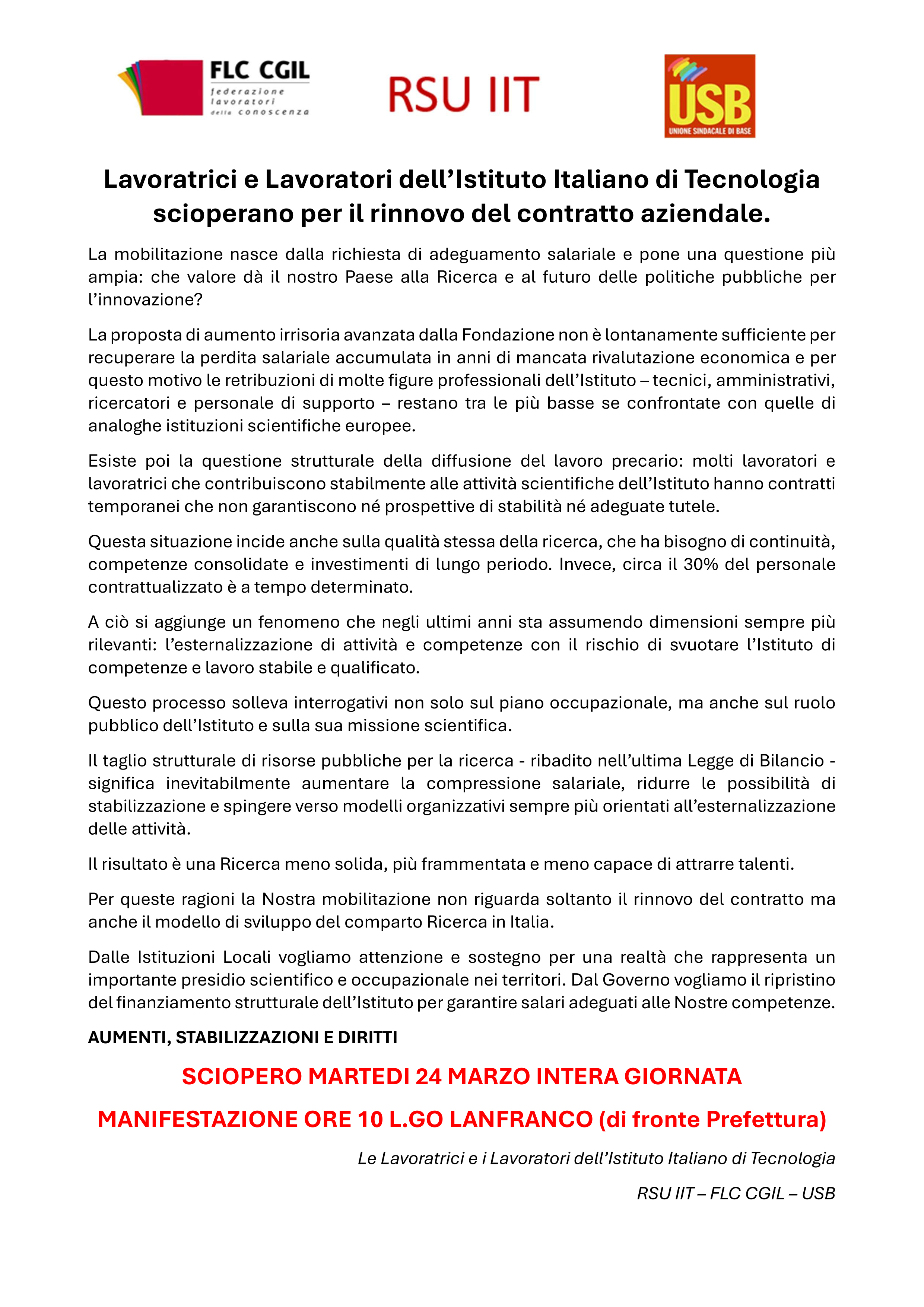 Istituto Italiano di Tecnologia sciopero per il rinnovo del contratto aziendale. RSU ITT, FLC CGIL, USB.